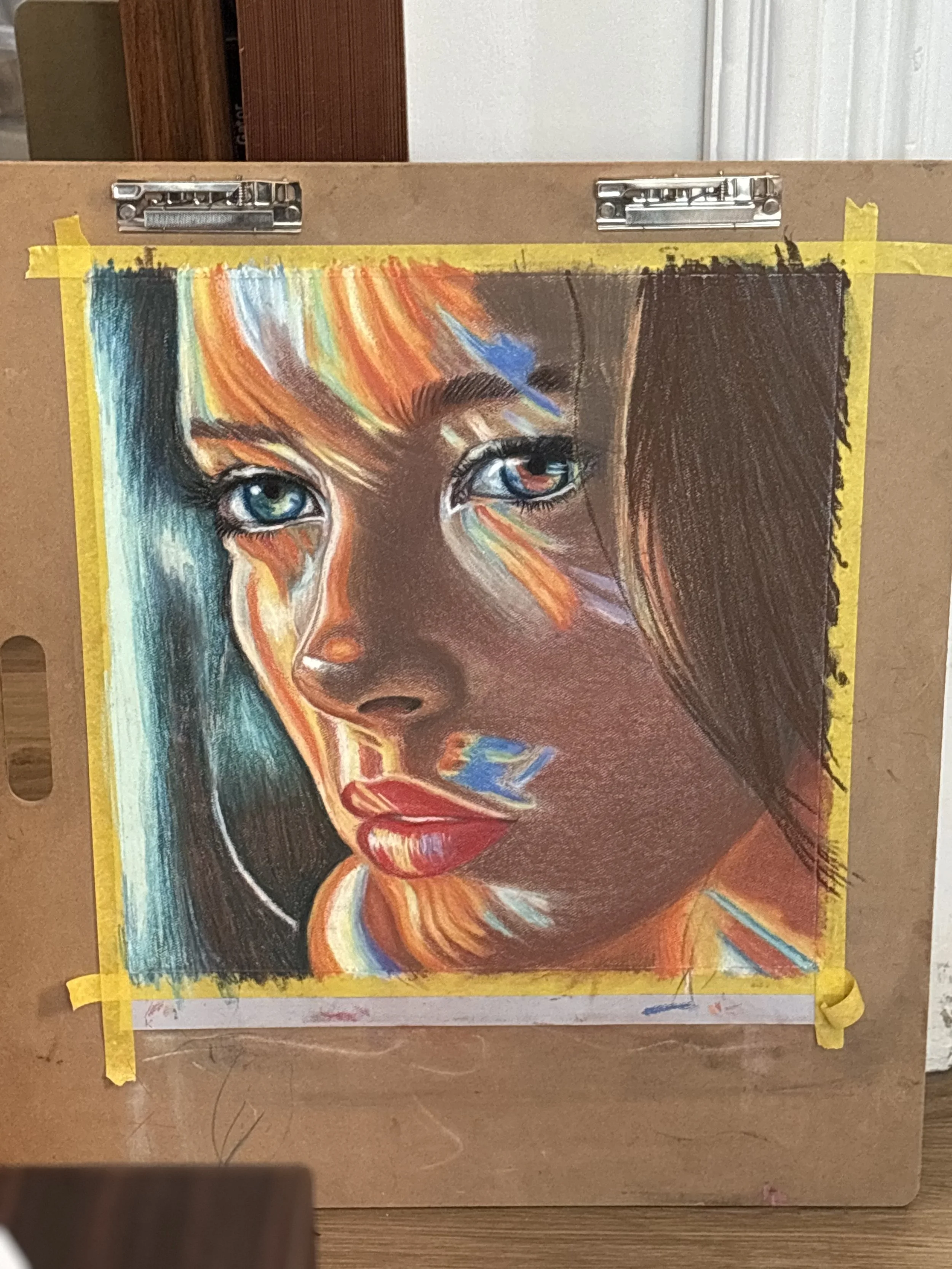 Featured here: Top right Pastel drawing in progress, left watercolor, bottom right Acrylic, bottom left ink